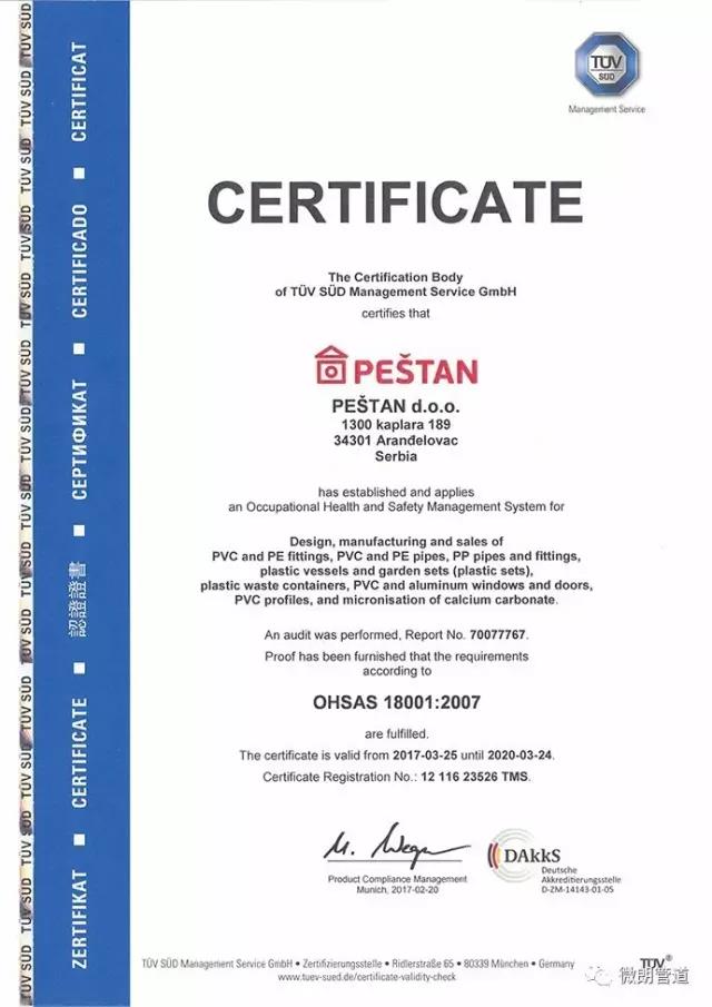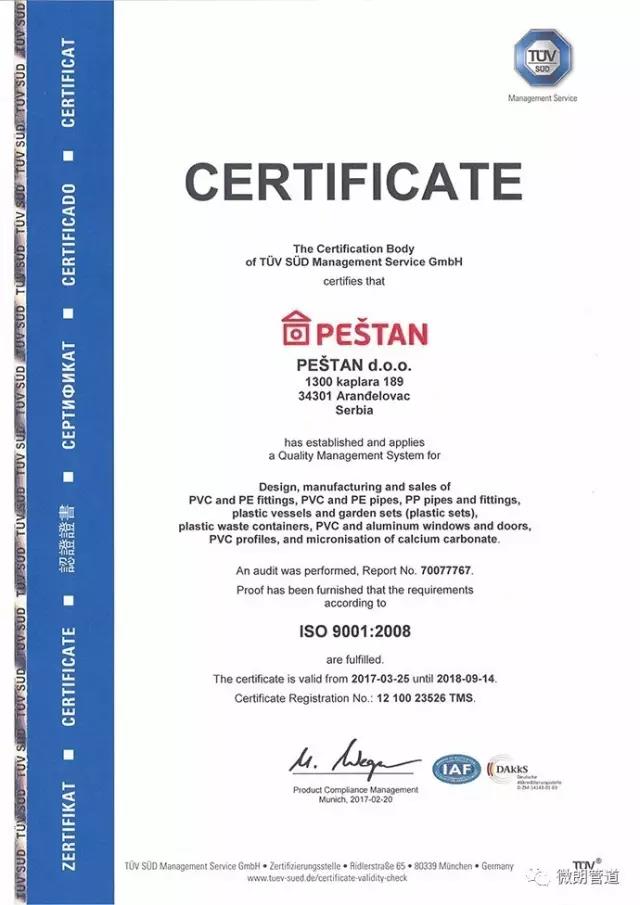 首先要介紹的就是管道行業(yè)中“ISO認(rèn)證”,對(duì)于“ISO 9001”想必大家一定不陌生,這個(gè)時(shí)常出現(xiàn)在生活中各類(lèi)產(chǎn)品說(shuō)明書(shū)中的詞匯,一提及到它我們所能聯(lián)想到的名詞就是“安全、權(quán)威”,其實(shí)ISO是國(guó)際標(biāo)準(zhǔn)化組織的簡(jiǎn)稱(chēng),是一個(gè)全球性的非政府機(jī)構(gòu),也是國(guó)際標(biāo)準(zhǔn)化領(lǐng)域中十分重要的組織,而9001則是質(zhì)量保證體系的代號(hào),屬于眾多ISO檢測(cè)中的一個(gè)門(mén)類(lèi),管道行業(yè)中有著“ISO14001”環(huán)境認(rèn)證、“ISO18001"健康管理認(rèn)證,這些認(rèn)證對(duì)消費(fèi)者選擇產(chǎn)品時(shí)有著非常重要的參考價(jià)值。但凡擁有“ISO9001”認(rèn)證的產(chǎn)品必然是安全的?其實(shí)不然,認(rèn)證的權(quán)威性則取決于頒布的機(jī)構(gòu),TUV檢測(cè)是一家隸屬德國(guó)最大集團(tuán)公司的第三方獨(dú)立機(jī)構(gòu),每年承擔(dān)著很多國(guó)家的授權(quán)任務(wù),是唯一受到美國(guó)國(guó)家認(rèn)可的檢測(cè)實(shí)驗(yàn)室,同時(shí)也是德國(guó)第一的檢測(cè)機(jī)構(gòu)。