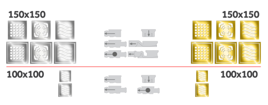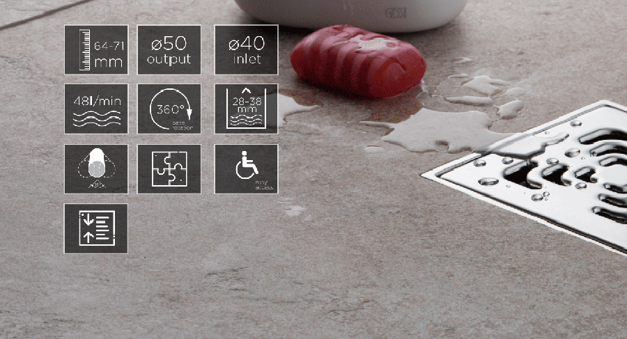 Peštan公司及其Confluo標(biāo)衛(wèi)浴在2種不同尺寸(100毫米x 100在100mm和150毫米×150毫米),6個不同的設(shè)計光柵可水渠(Prohrom“潮”不銹鋼“滴”不銹鋼“廣場”金“潮”黃金“滴“金”廣場“),6種不同的堿(水平基座1個輸出,與1點的輸入/輸出1水平基部,水平基座3的輸入/輸出1,其基為40mm水柱,其基極用30mM水溶液螺柱,垂直堿)和3種不同類型虹吸(在-S為主虹吸,干虹吸管虹吸杯)的。所有基地Confluo標(biāo)準(zhǔn)模型具有DN和DN輸出50毫米40毫米與高達48升/分鐘的流速進入。從74毫米最低高度毫米到95毫米視型號而定。